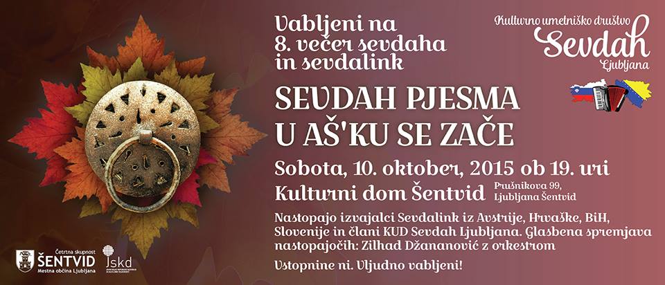 Kulturno-umetniško društvo Sevdah iz Ljubljane vljudno vabi na »8. Večer sevdaha in sevdalink«, ki bo v soboto (10.10.2015) z začetkom ob 19h v prostorih Kulturnega doma v Šentvidu (Prušnikova 99, Ljubljana-Šentvid). Vstopnine za dogodek ni.
