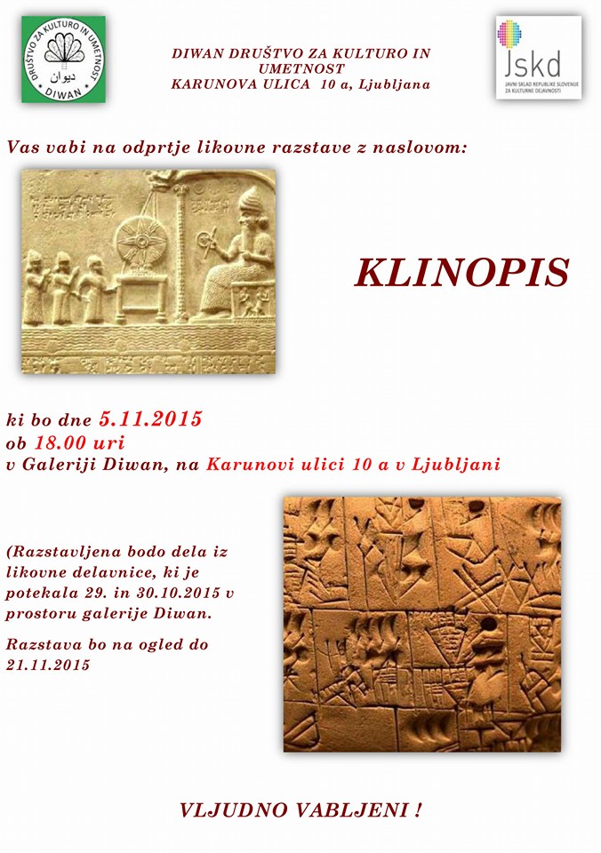 Društvo za kulturo in umetnost Diwan iz Ljubljane vabi na otvoritev likovne razstave Klinopis, ki bo danes (05.11.2015) ob 18h v Galeriji Diwan na Karunovi ulici 10 v Ljubljani. Razstavo si je možno ogledati do 21.11.2015.