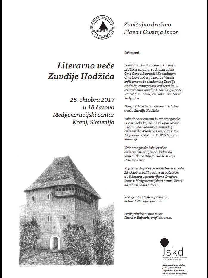 Zavičanjo društvo Plava i Gusinja Izvor vljudno vabi na literarni večer črnogorskega književnika, Zuvdije Hodžića. Dogodek bo izveden v sredo (25.10.2017) z začetkom ob 18h, v prostorih društva Izvor (Medgeneracijski center Kranj, Cesta talcev 7).