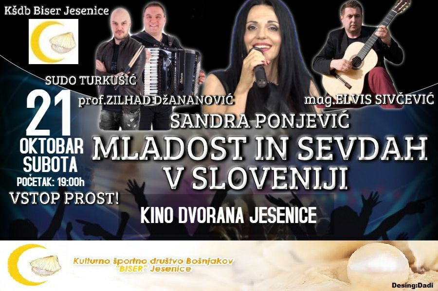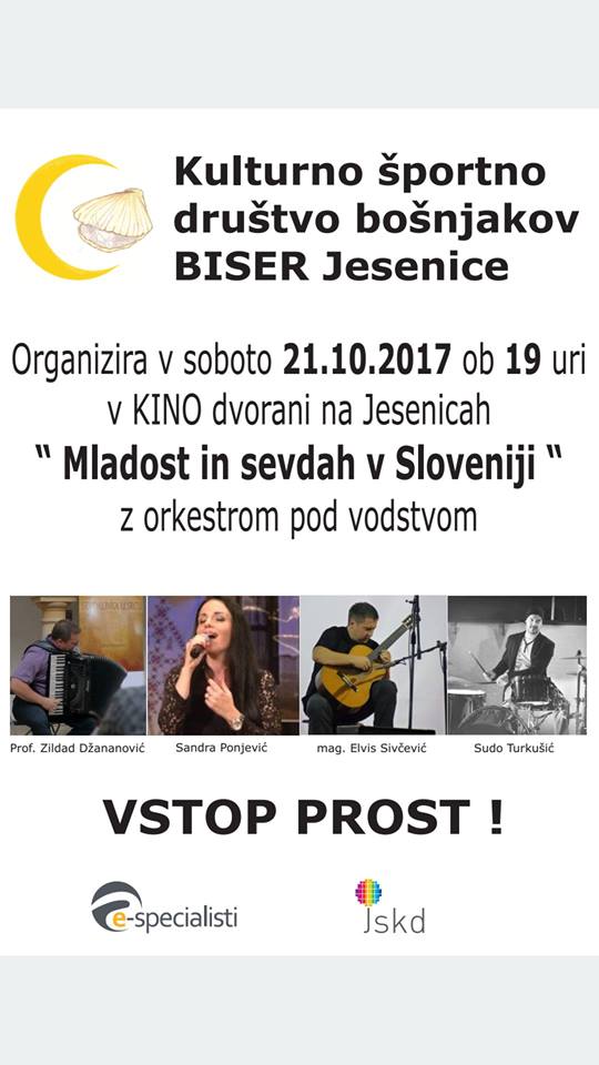 Kulturno športno društvo Bošnjakov Jesenice vljudno vabi na koncert z orkestrom, katerega so poimenovali »Mladost in Sevdah v Sloveniji«. Dogodek se bo izvajal v Kino dvorani Jesenice (Trg Toneta Čufarja 4), v soboto (21.10.2017) z začetkom ob 19h. Vstop je brezplačen.