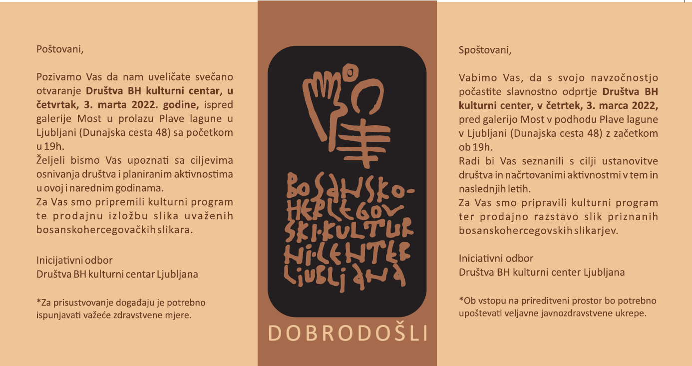 Vljudno vabljeni na svečano odprtje bosanskohercegovskega kulturnega centra. Ceremonija bo potekala jutri (3. marca 2022) pred galerijo Most v Linhartovem podhodu (Plava Laguna, Dunajska cesta 48, 1000 Ljubljana) ob 19 uri.