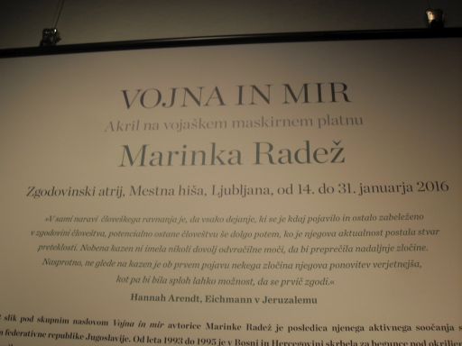 V zgodovinskem atriju ljubljanske mestne hiše (Mestni trg 1) so 14.01.2016 odprli razstavo Marinke Radež z naslovom »Vojna in mir«. Razstavo si lahko brezplačno ogledate do 31.01.2016.