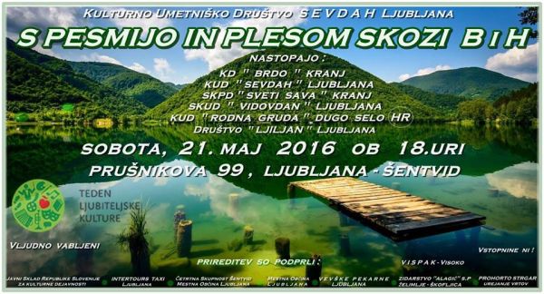 Kulturno umetniško društvo Sevdah iz Ljubljane vljudno vabi na kulturni večer, ki so ga poimenovali »S pesmijo in plesom skozi BIH«, ki bo v soboto (21.05.2016) z začetkom ob 18h v prostorih kulturnega doma Ljubljana-Šentvid (Prušnikova cesta 99). Vstop je brezplačen.